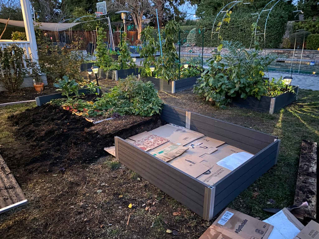 You can build your raised bed on top of concrete surfaces, or like me, on top of grass. If you do, I recommend sheet mulching to kill the existing grass and prevent it from growing through the raised bed.